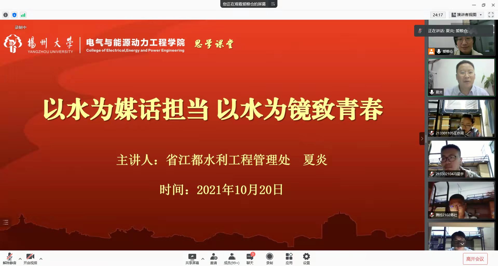 2021年10月20日,江苏省江都水利工程管理处党办主任,水利水电动力工程专业2000届校友夏炎应邀为学生作专题报告。