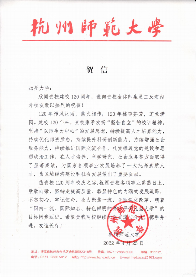 杭州师范大学贺信