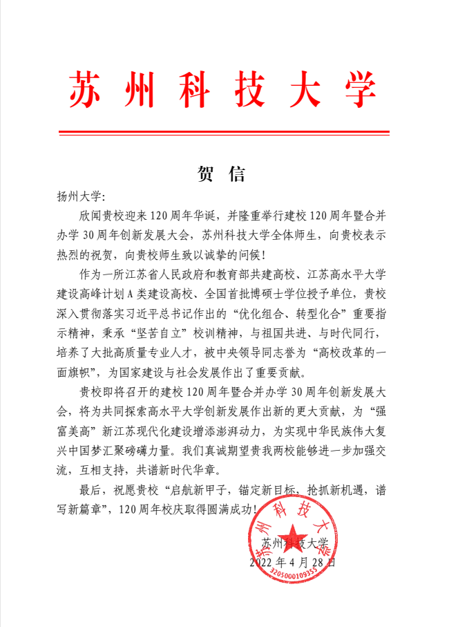 苏州科技大学贺信