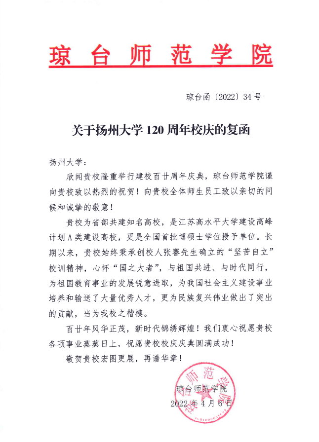琼台师范学院贺信