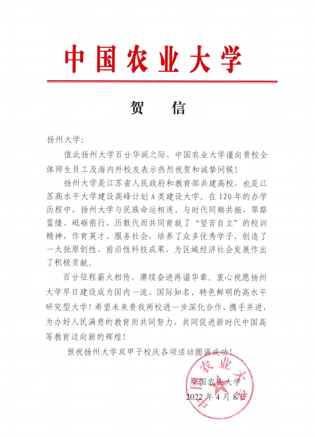 中国农业大学贺信