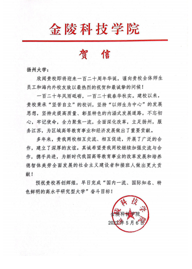 金陵科技学院贺信