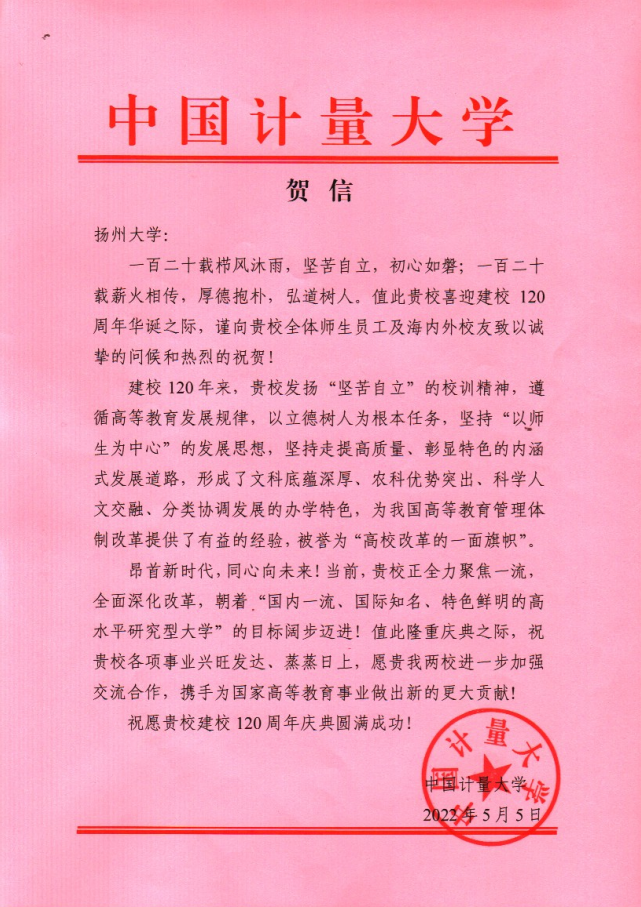 中国计量大学贺信