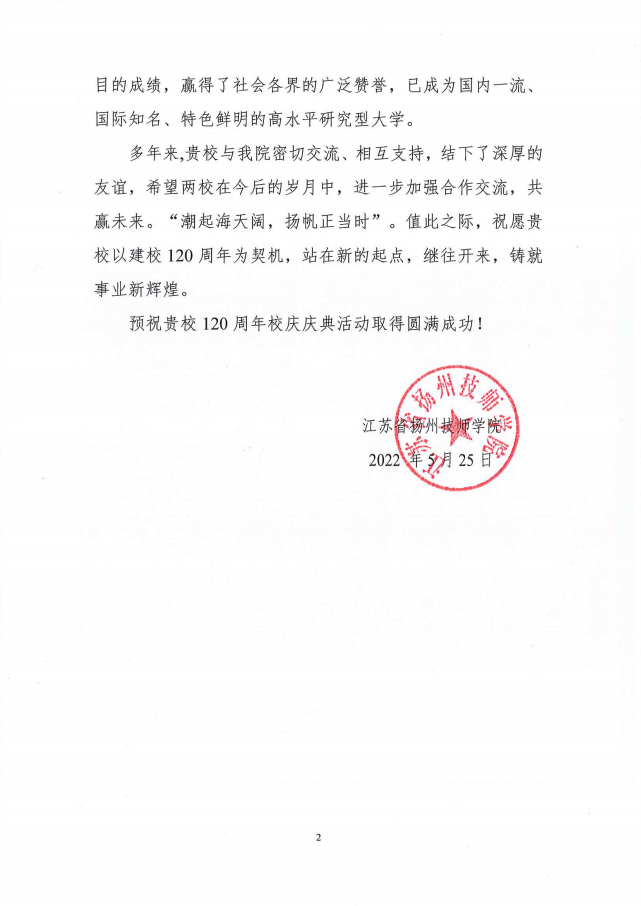 江苏省扬州技师学院贺信