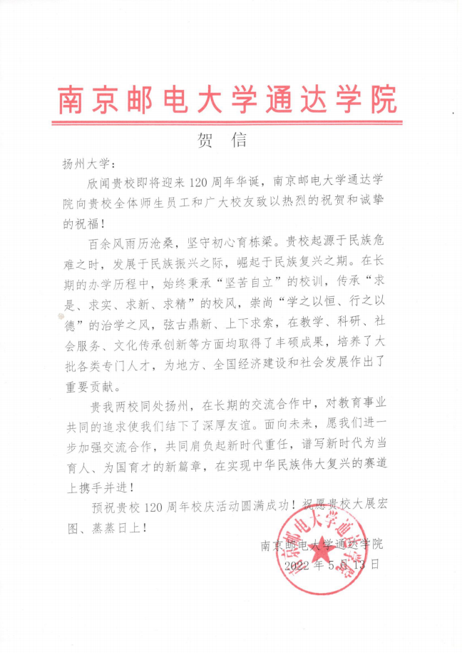 南京邮电大学通达学院贺信