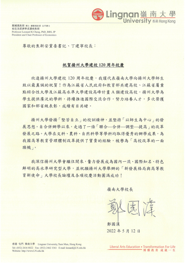 嶺南大學(香港)贺信