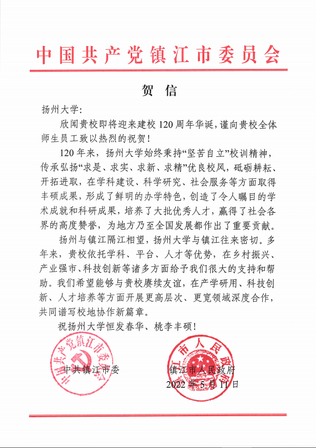 中共镇江市委、市政府贺信