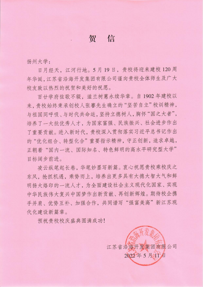 江苏省沿海开发集团贺信