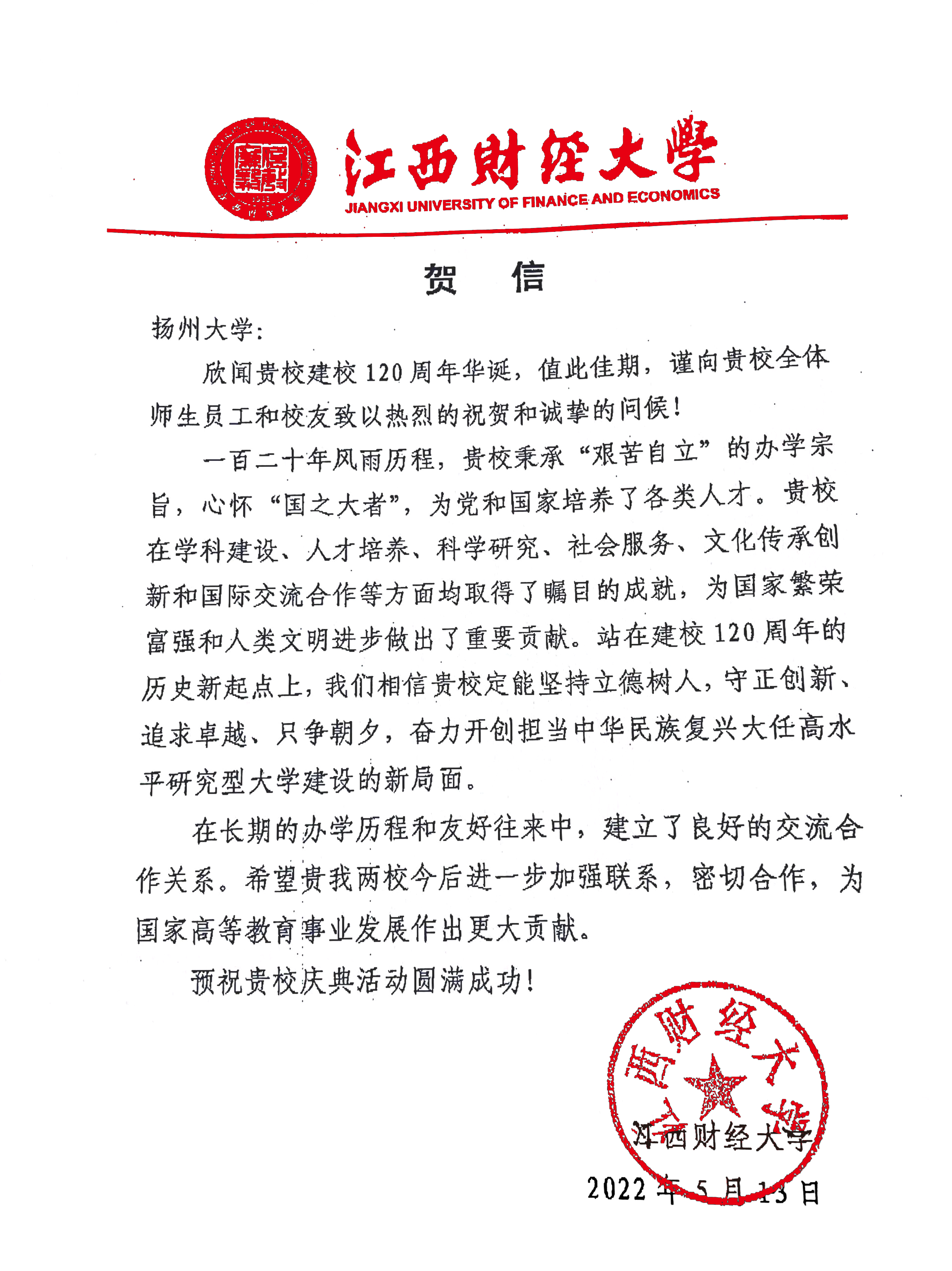 江西财经大学贺信