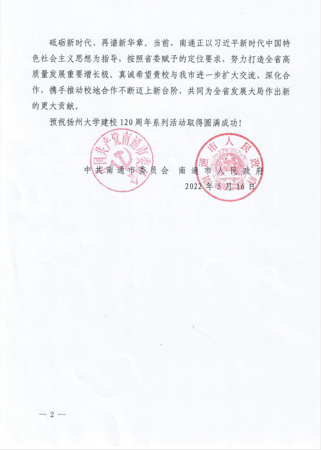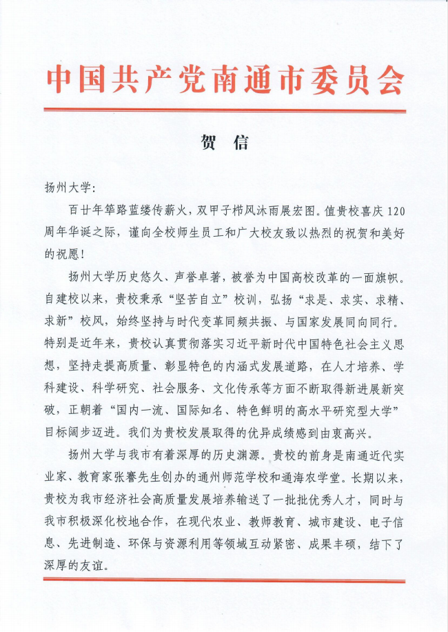 中共南通市委、市政府贺信