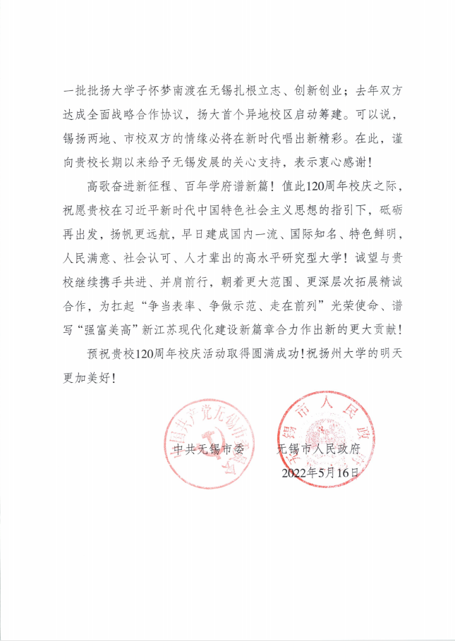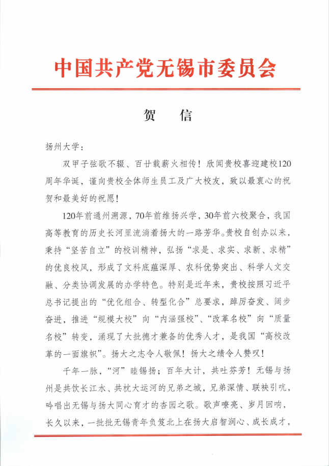 中共无锡市委、市政府贺信